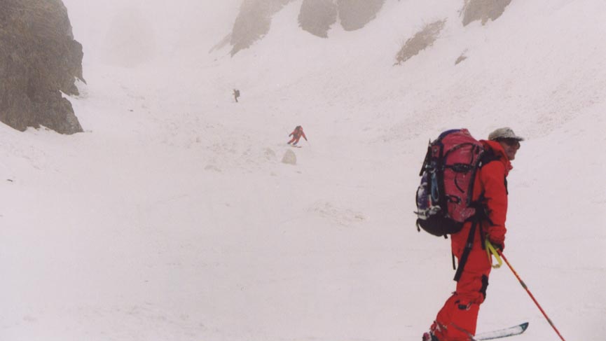 ガスの中を唐松岳よりガキ谷を滑る。上から佐藤、高尾、田中。