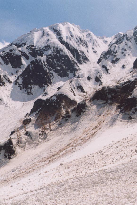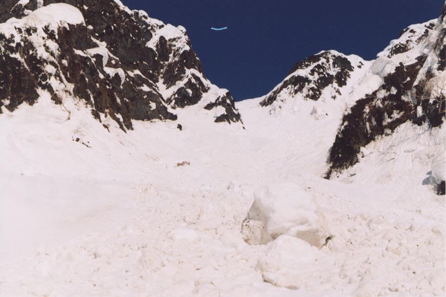 明日の天気が怪しいので今日中に扇沢を滑ることにする。種池からはシュプールがたくさんある。急斜面が続くが、滑ると表面の重い雪の層がゆっくりと雪崩れていく。かまわずどんどん下る。爺より種池寄りに滑った方が斜面は開けていて大きくターンが出来る。急斜面が終わりゆっくりしていると、前方で左岸から大きなブロック崩壊がありビックリさせられた。更に滑っていくと奥小沢の出合でまたビックリ。巨大雪崩の跡があり右から雪面がU字状になって本谷を遮っている。U字の左右の壁は3mほどある。