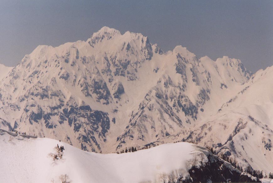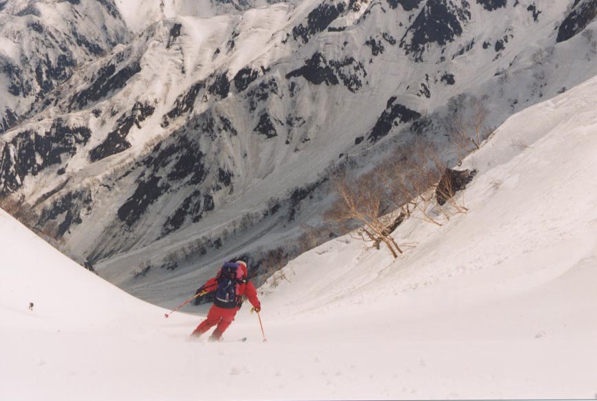 しかし北峰を越え、本峰に上がりスキーに履き替えればもうこちらのものである。鹿島槍から棒小屋沢までの斜面は今山行のハイライトであった。縦走していた人が我々の急斜面に滑り出すのを見て驚いていたが、斜面は広く雪質も程良いクラストで何も問題はない。みんな気持ちよさそうに滑っている。カービング、テレマーク、ベンディングと色々なスタイルで滑っている。遮るものが何もない大斜面にシュプールが次々刻まれていく。これが山スキーの至福の時である。