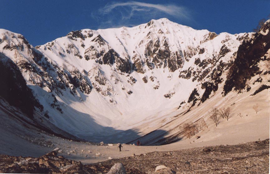 鹿島北壁基部よりキレット沢を望む。これを登って主稜線に出た。