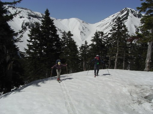 薬師見平付近を登るボンタと芝田背後はスゴ沢