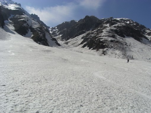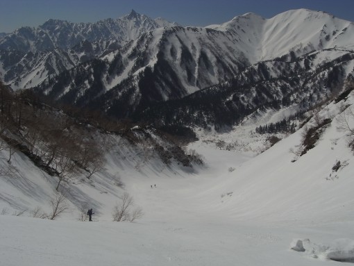 北鎌尾根を正面に樅沢を滑る