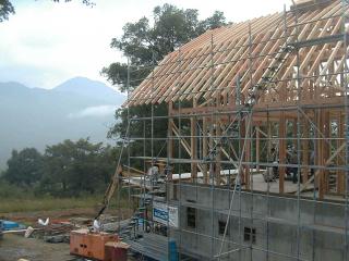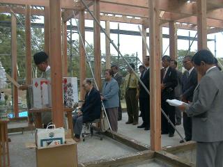 この日は早朝から木造部分の軸組がなされ、われわれが現地到着した午後3時半に は、屋根の骨組みまですっかり建ち上がっていて、その堂々たるたたずまいに感激しました。